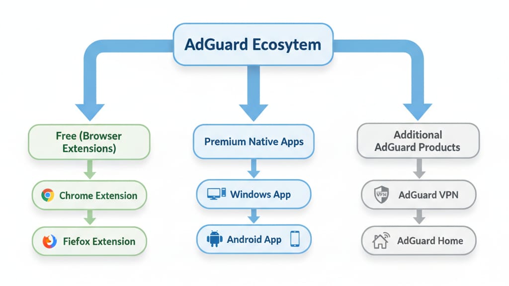 The adguard browser extension free vs paid debate misses the mark because the browser extensions are entirely free. The free mobile modes face heavy restrictions by platform rules.