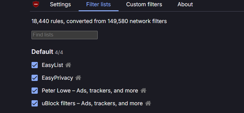 Open the uBO dashboard (click icon → gear icon) → Filter lists → confirm enabled: uBlock filters (all defaults), EasyList, EasyPrivacy, Peter Lowe's Ad and tracking server list.