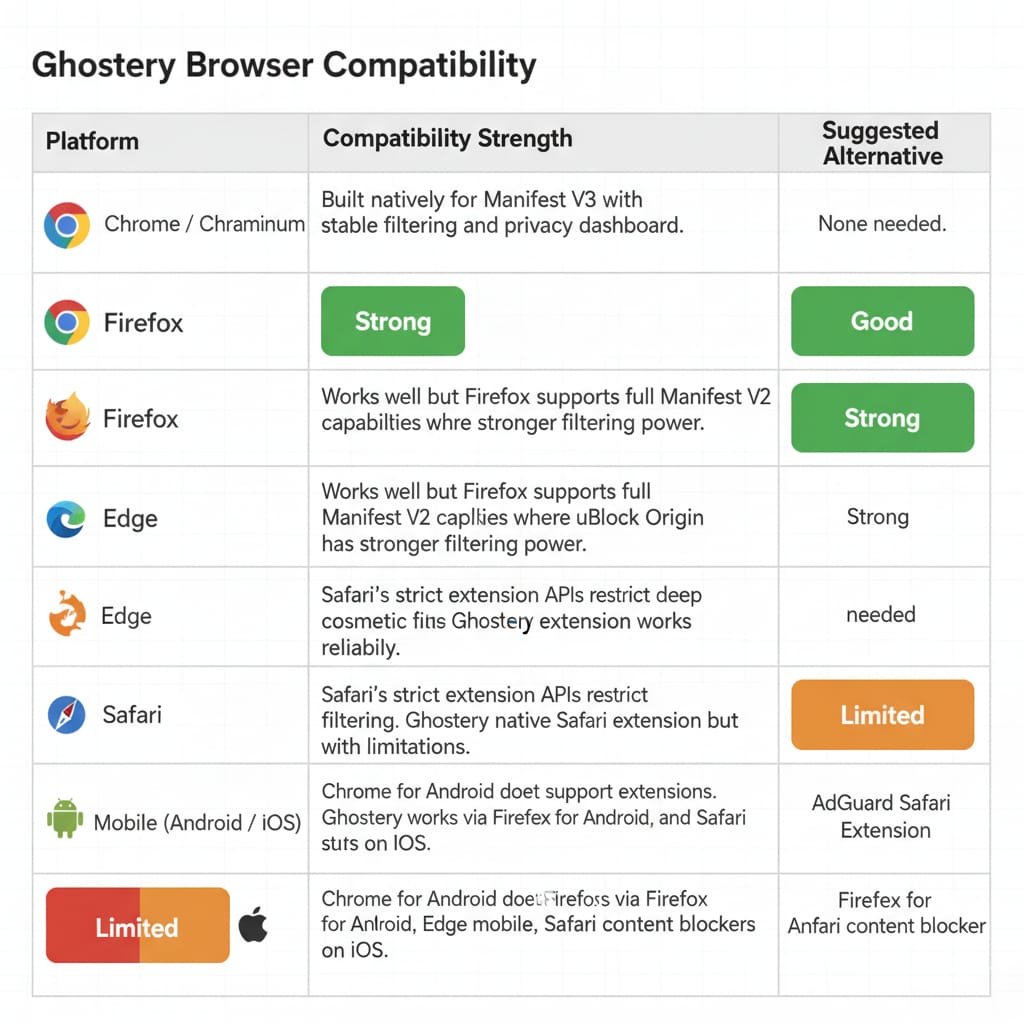 Ghostery thrives on Chrome under Manifest V3, making it a top recommendation for the Google ecosystem, though varying APIs limit its reach on Safari and mobile.