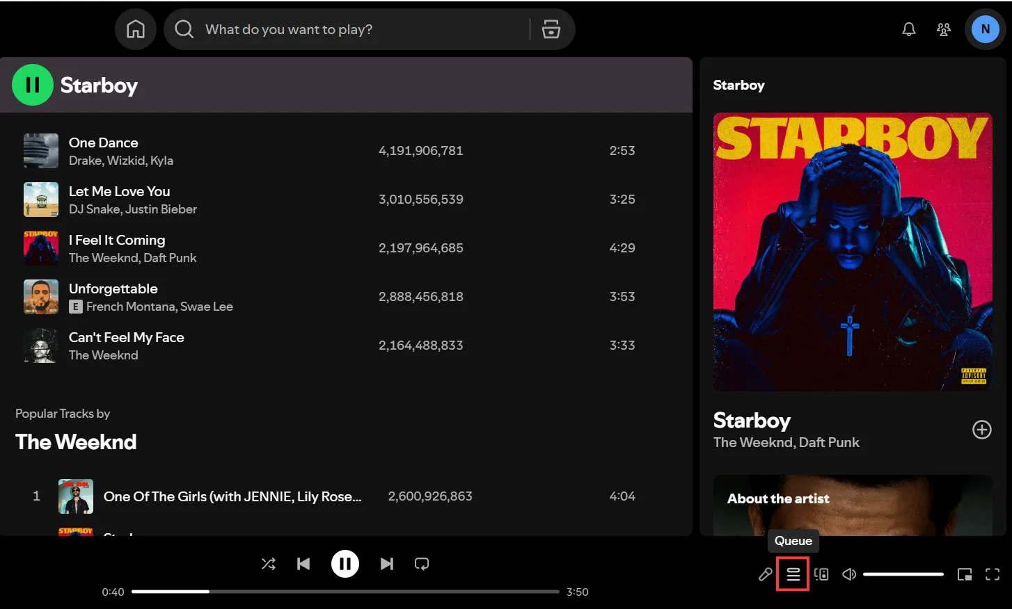 - Click the Queue icon (three stacked lines) in the bottom right corner of the playback control bar.