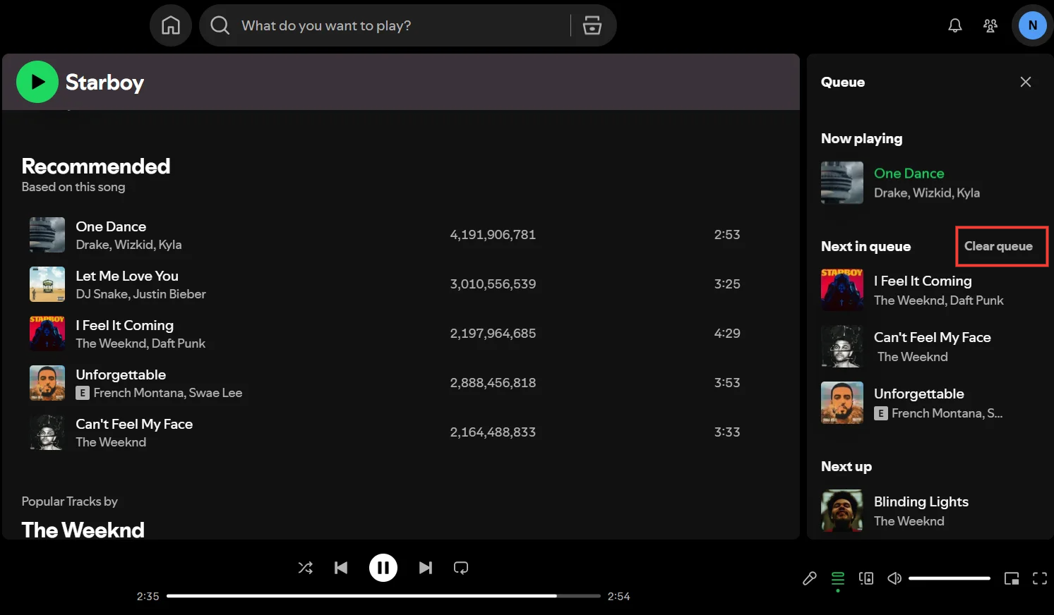 Note: If the Clear button is missing, Spotify is playing from a playlist, album, or Smart Shuffle. To stop these upcoming tracks, play a new song or toggle off Autoplay.